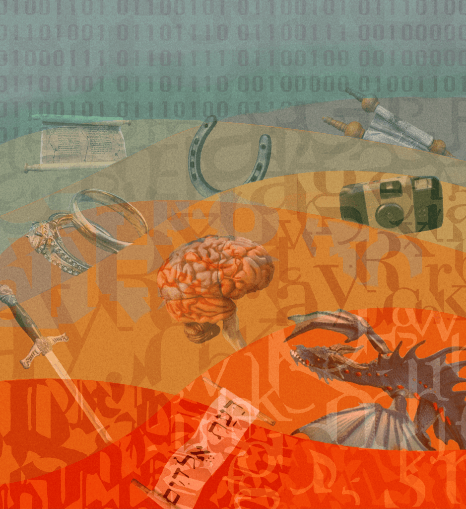 I was provided with photographed objects (representing each author’s chapter) that the authors wanted on the final cover. I started developing a concept around these photos with a moodboard I presented to the seniors. Inspired by the back cover blurb, we agreed on a concept that brought the past and present together on desert sands.